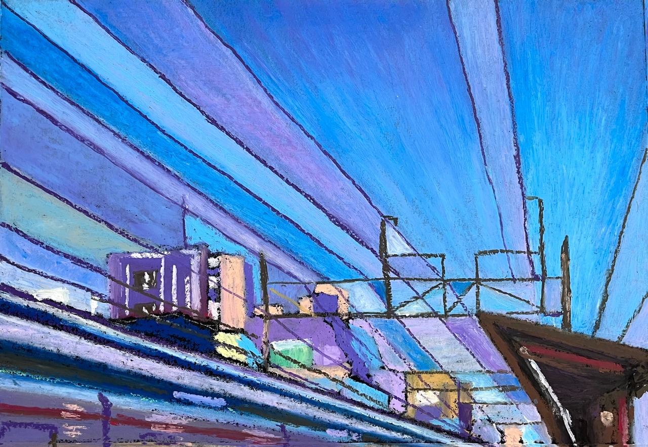 【オイルパステル原画】夕暮れの空と電線